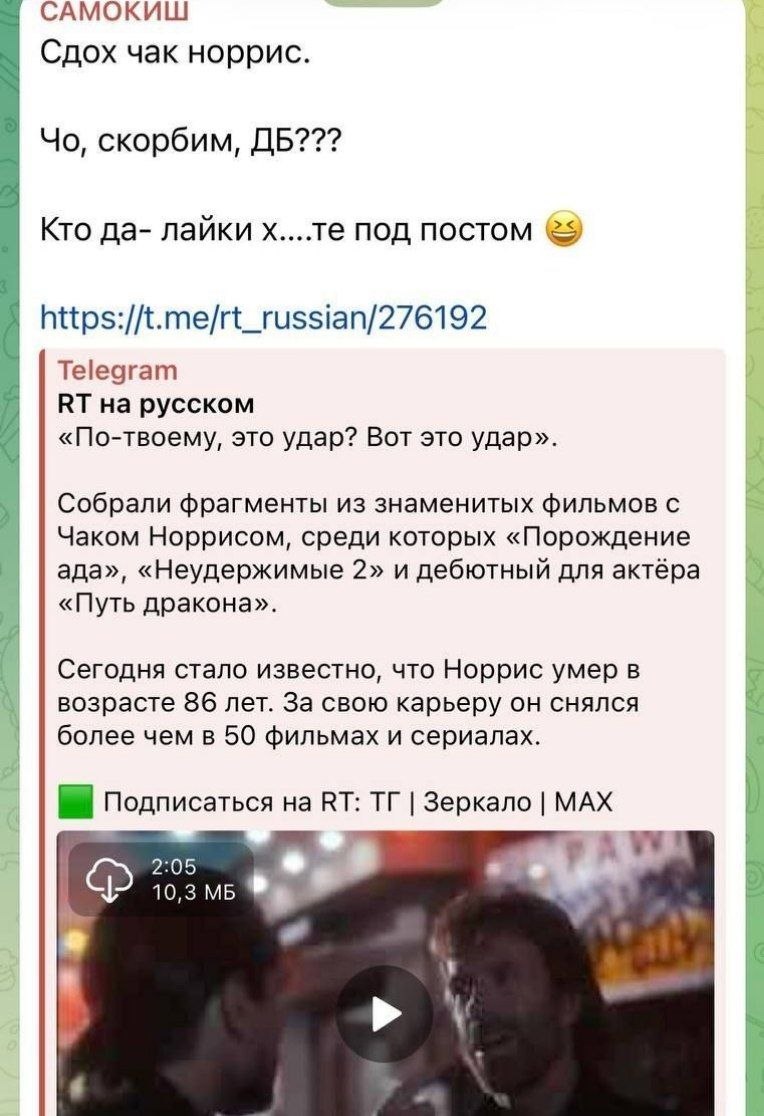 Накануне появилась информация о смерти актера — легенде боевиков было 86 лет. В тот же вечер, по данным пользователей, в телеграм-канале депутата появился пост с формулировкой «Сдох чак норрис» (орфография автора сохранена). В комментариях также звучали резкие высказывания.