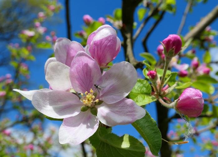 Яблони могут размножаться половым путем через цветение и опыление. Каждую весну на деревьях распускаются великолепные цветы различных оттенков. Опыление происходит, когда пыльца с тычинок переносится на пестики цветков, что ведет к оплодотворению и началу формирования плодов.