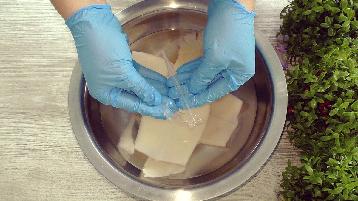 Кальмары следует освободить от всего лишнего. Существует множество способов их приготовления, но одним из самых простых является использование горячей воды: достаточно вскипятить чайник и залить тушки кальмаров кипятком на 10 минут. Это позволит сохранить их мягкость и деликатный вкус.
