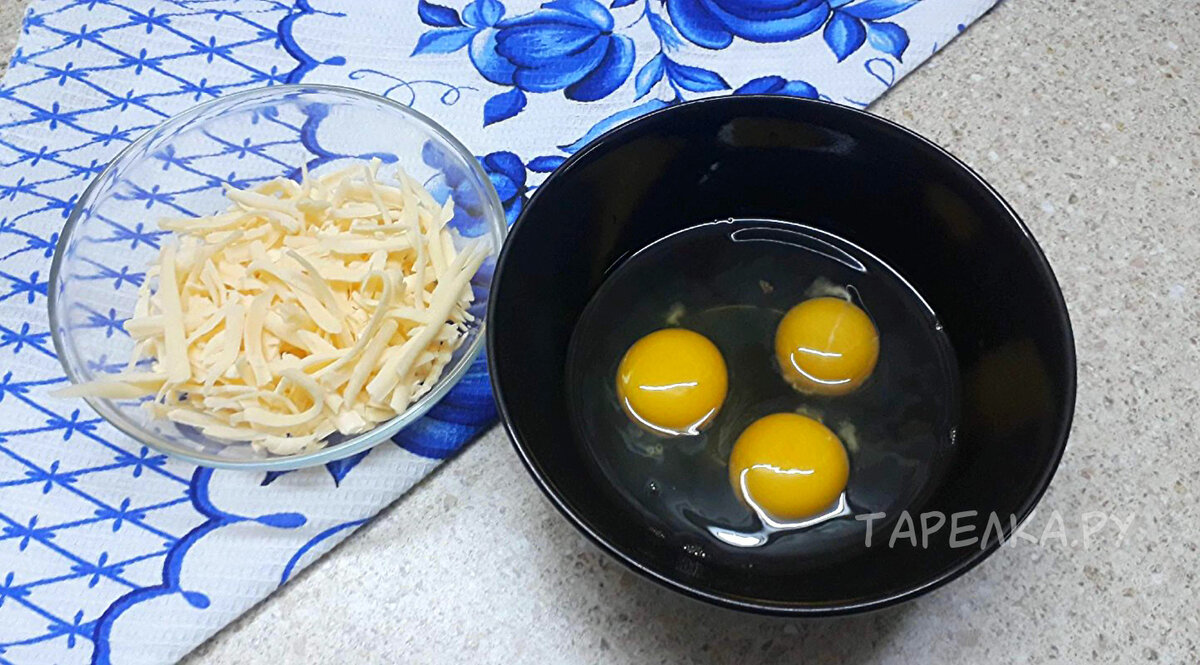 - На крупной терке натираем твердый сыр и смешиваем его с яичной смесью.