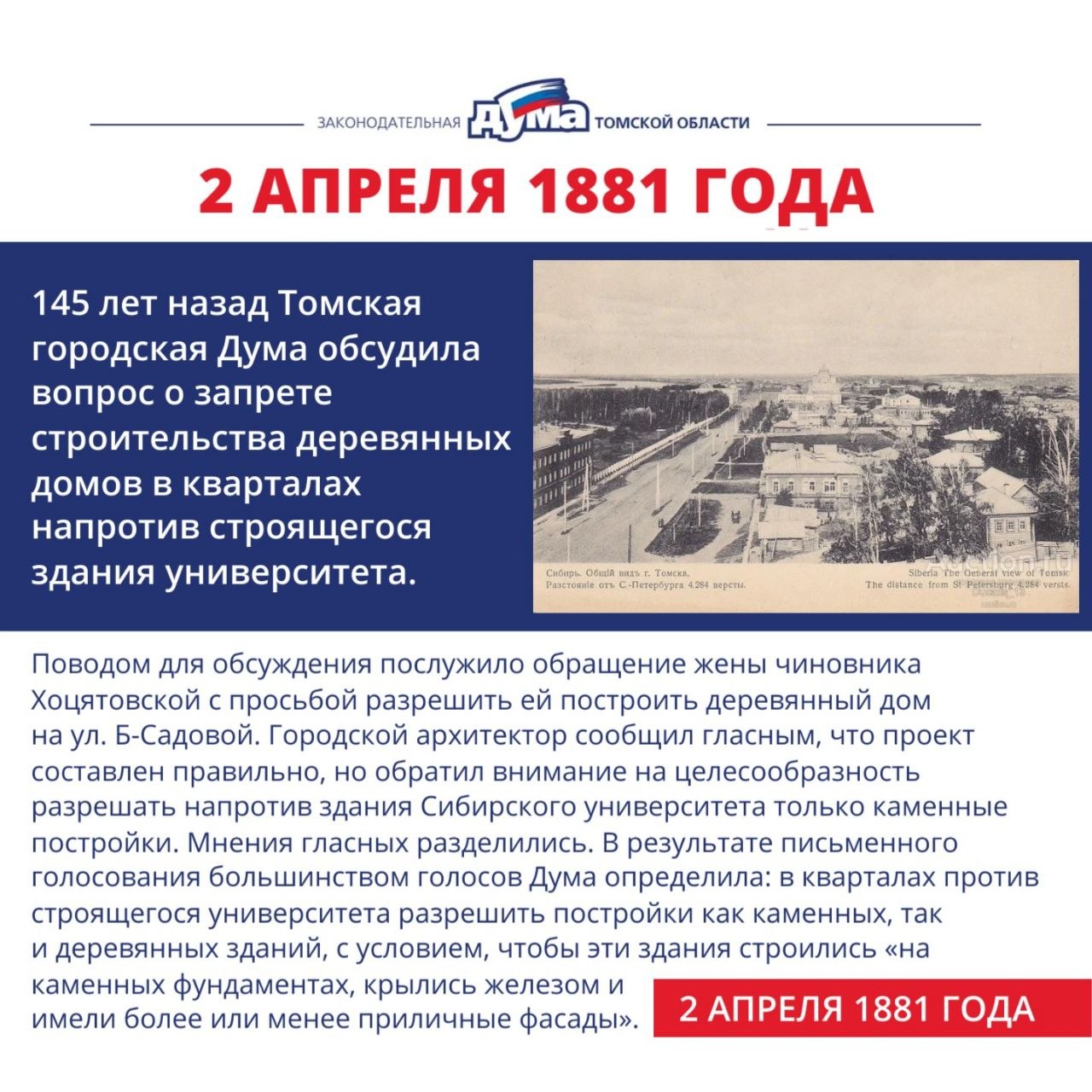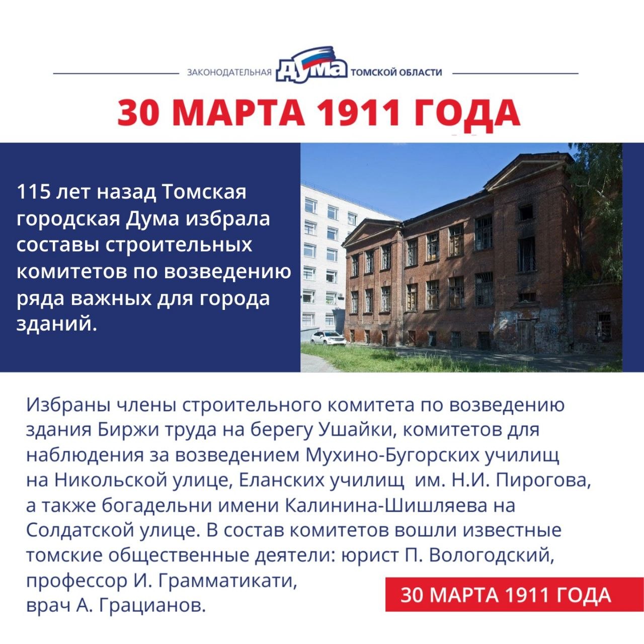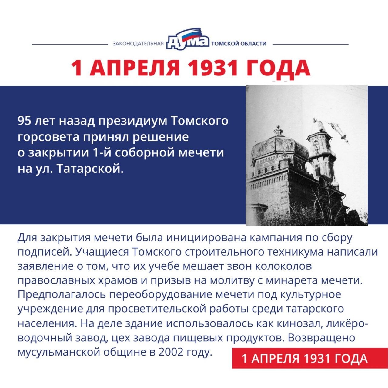 Интересные события с 30 марта по 5 апреля в истории томской представительной власти: строительство народных училищ и зданий рядом с университетом, долгий путь соборной мечети и Воскресенского храма от закрытия до возвращения верующим.