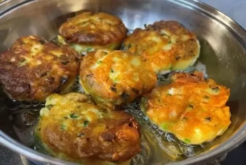 Когда тесто готово, к нему добавляется начинка, и ещё раз все тщательно смешивается. Далее сковорода нагревается с растительным маслом на маленьком огне. Пирожки обжариваются с обеих сторон под закрытой крышкой до появления золотистой корочки. Для избавления от лишнего жира готовые пирожки следует положить на бумажное полотенце.