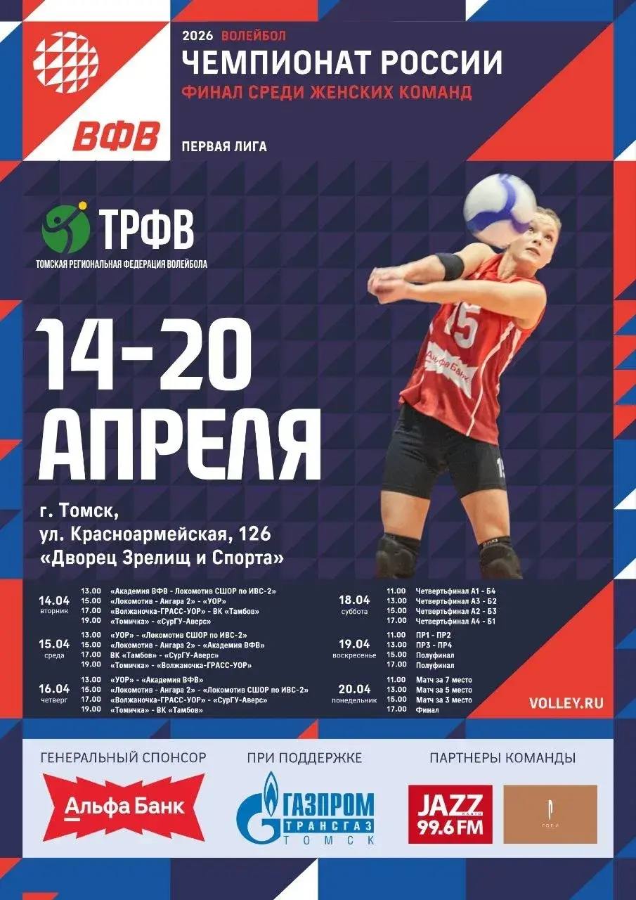 С 14 по 20 апреля финальный этап чемпионата России среди женских команд первой лиги пройдет в томском Дворце зрелищ и спорта (ул. Красноармейская, 126).