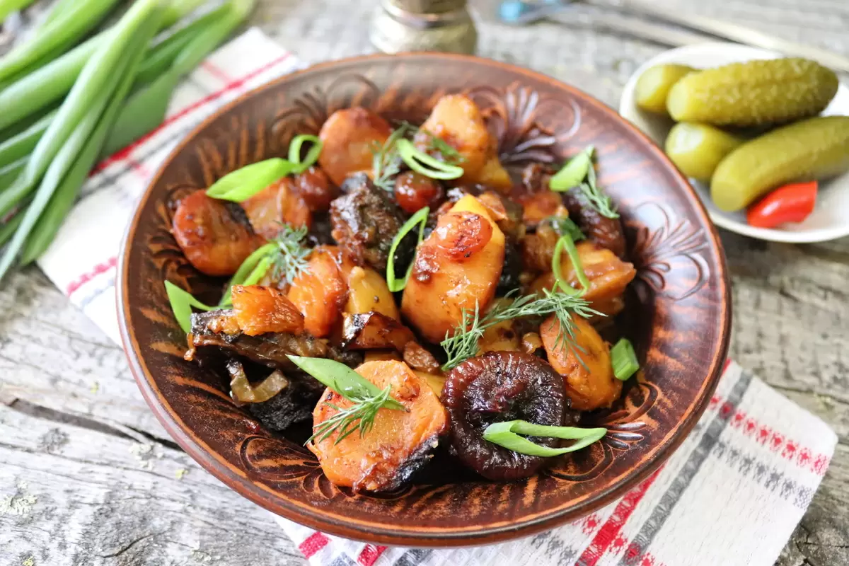 Лук нарезается полукольцами и обжаривается до золотистого цвета, а картофель и морковь — нарезаются крупными кусками и пятачками соответственно. Все ингредиенты культурно располагаются в казане или в жаропрочной форме, где мясо обжаривается до румяной корочки, затем добавляются овощи, сухофрукты и обжаренный лук. И для завершения процесса — всё это закрывается крышкой и помещается в духовку.