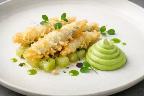 Корюшка — это уникальная северная рыба, обладающая свежим ароматом огурца и нежным, сочным мясом. Благодаря своей мягкой текстуре, корюшка готовится очень быстро и прекрасно гармонирует с легкими гарнирами и изысканными соусами. В этом рецепте акцент сделан на природную свежесть корюшки, которая раскрывается через несколько различных текстур: хрустящая темпура сохраняет сочность рыбы, а огурец конфи придает блюду мягкость и насыщенность, в то время как воздушный мусс из зелёного горошка добавляет сладковатую сливочность и уравновешивает вкус.