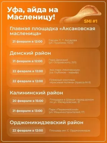Скоро в Уфе стартует Масленица — один из самых ярких и долгожданных праздников весны. На этой неделе жители всех районов города смогут насладиться традиционными гуляниями, полными веселья и смеха.