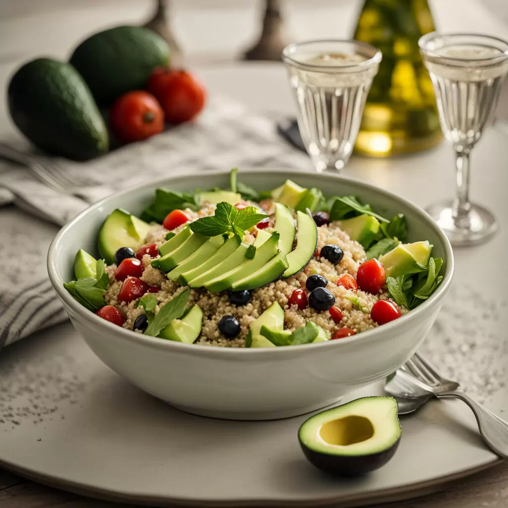 - Ингредиенты: киноа, авокадо, свежие овощи и оливковое масло.