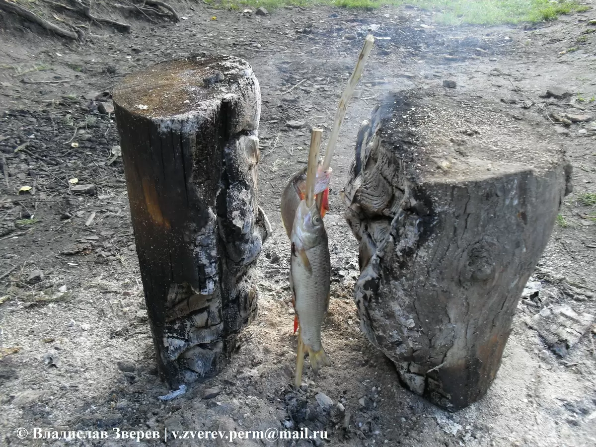 Прежде всего, необходимо разжечь огонь между двумя поленьями. Как только они прогорят наполовину, воткните их в землю так, чтобы раскаленные стороны были направлены друг к другу на расстоянии около 20 сантиметров. Теперь можно разместить шпажки с рыбой между поленьями и ожидать, пока она пропечется от жара углей.
